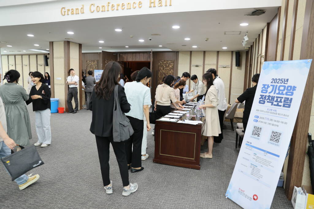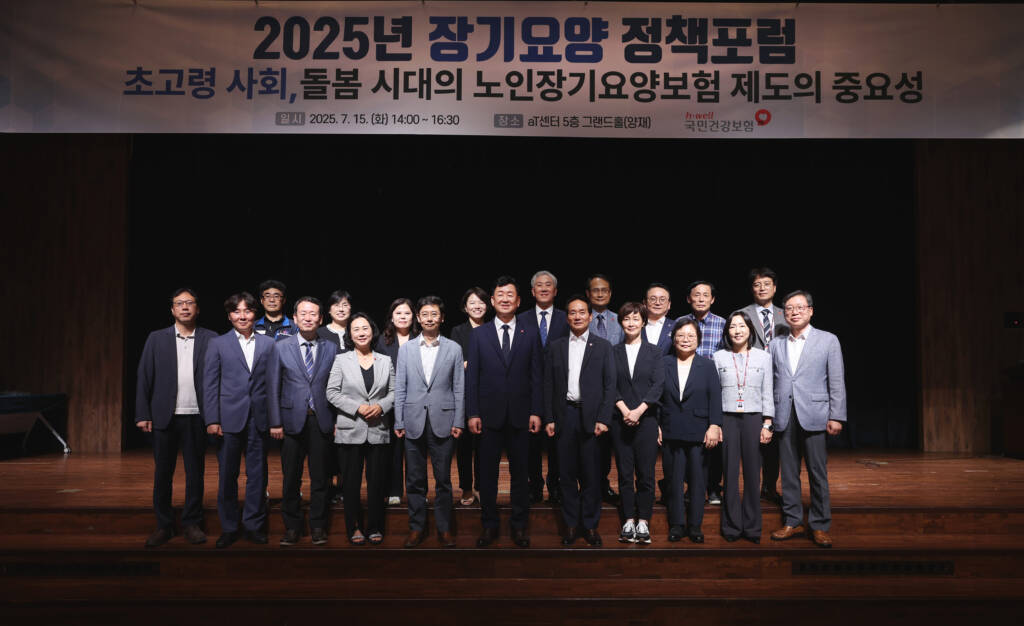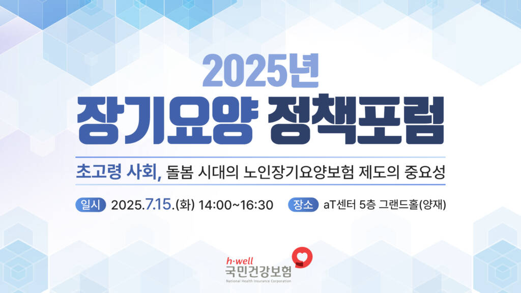 2025년 장기요양 정책포럼주제: 초고령 사회, 돌봄 시대의 노인장기요양보험 제도의 중요성주최: 국민건강보험공단(NHIS)일시: 2025.7.15.(화) 14:00~16:30장소: aT센터 5층 그랜드홀