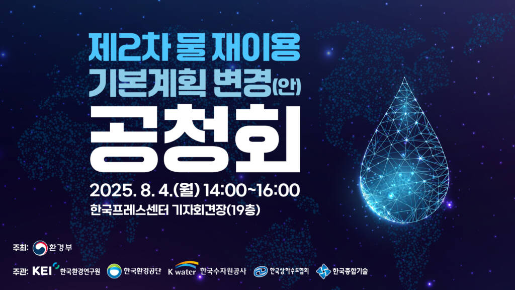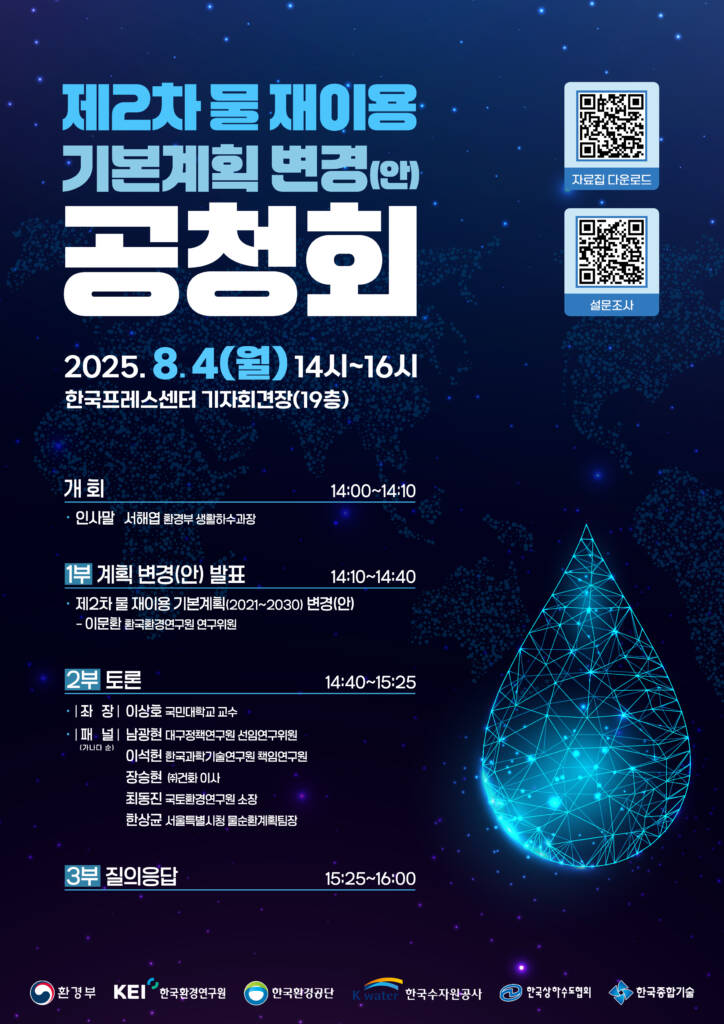 물 재이용 기본계획 공청회14시간 agoClient한국환경연구원Year2025.8.4.Place한국프레스센터 기자회견장Share 제2차 물 재이용 기본계획 변경(안) 공청회주최: 한국환경연구원일시: 2025.8.4.(월) 14:00~16:00장소: 한국프레스센터 기자회견장(19층)
