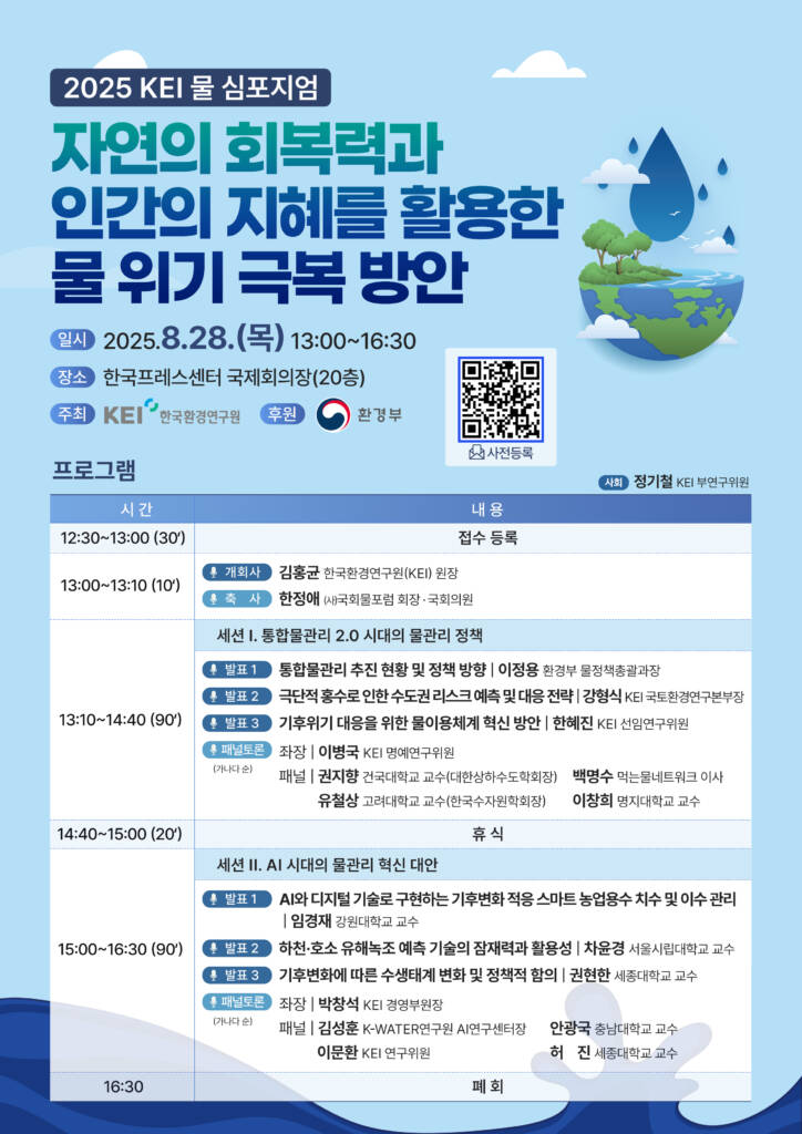 2025 KEI 물 심포지엄14시간 agoClient한국환경연구원Year2025.8.28.Place한국프레스센터 국제회의장Share 주제: 자연의 회복력과 인간의 지혜를 활용한 물 위기 극복 방안주최: 한국환경연구원일시: 2025.8.28.(목) 13:00~16:30장소: 한국프레스센터 국제회의장(20층)